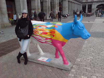 A partir de ahora vamos a intentar contar, además de nuestros viajes y excursiones actuales, algunas de las que hemos hecho en el pasado. Empezaremos con la visita que hicimos en enero (aprovechando uno de los escasísimos fines de semana en los que no trabajaba, que eran como uno cada dos meses) a Madrid con motivo de la Cow Parade. Por si alguien no se enteró, lo explicamos aquí. Durante unos meses las calles de Madrid fueron tomadas por 105 vacas de fibra de vidrio, decoradas por diferentes autores, que ocuparon los rincones más conocidos de la ciudad. Nosotros no pudimos verlas todas porque en un día es prácticamente imposible, pero tuvimos una jornada de turismo muy divertida.