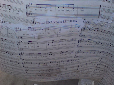 A simple vista y desde lejos parece una vaca blanca con unas ligerísimas manchas blancas. Había que acercarse bastante para ver la gracia de la vaca, que es la canción que aparece en las partituras que rodean su cuerpo.